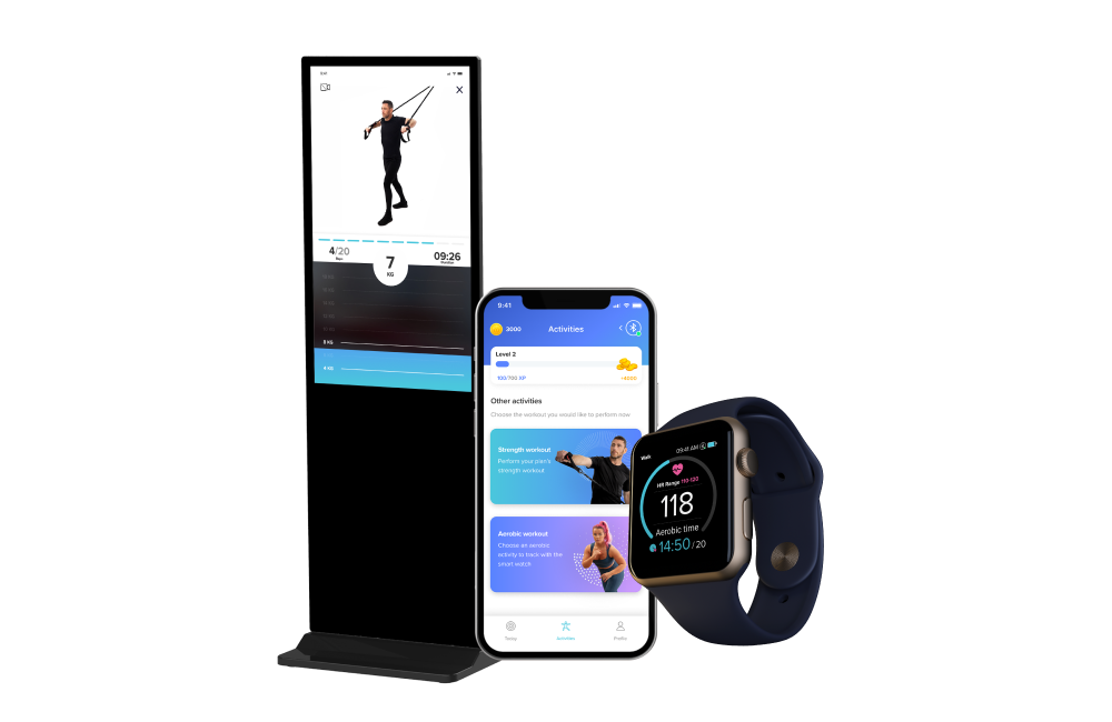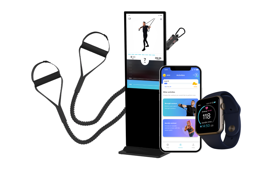 The program combines strength training with resistance bands, and is customized to your team's goals. Additionally, the platform offers optional aerobic training with heart rate monitoring and step counting. All of these features are easily accessible through a user-friendly app and an admin dashboard.